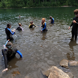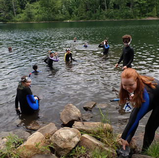 After breaking for lunch, we headed out to #10 Pond. On Tuesday, it hit high 90s, and the snorkel was a nice refresher. On Wednesday, it was cloudy and chillier. The snorkel was to test gear for the trip, get comfortable in the water, and see local fish. There were adult and juvenile smallmouth bass, and a few bass nests. There were many sunfish, with one male seen displaying his colors on his circular nest. Schools or perch swam by, one catfish was seen, and a painted turtle! We could hear loons calling from further in the pond as well.